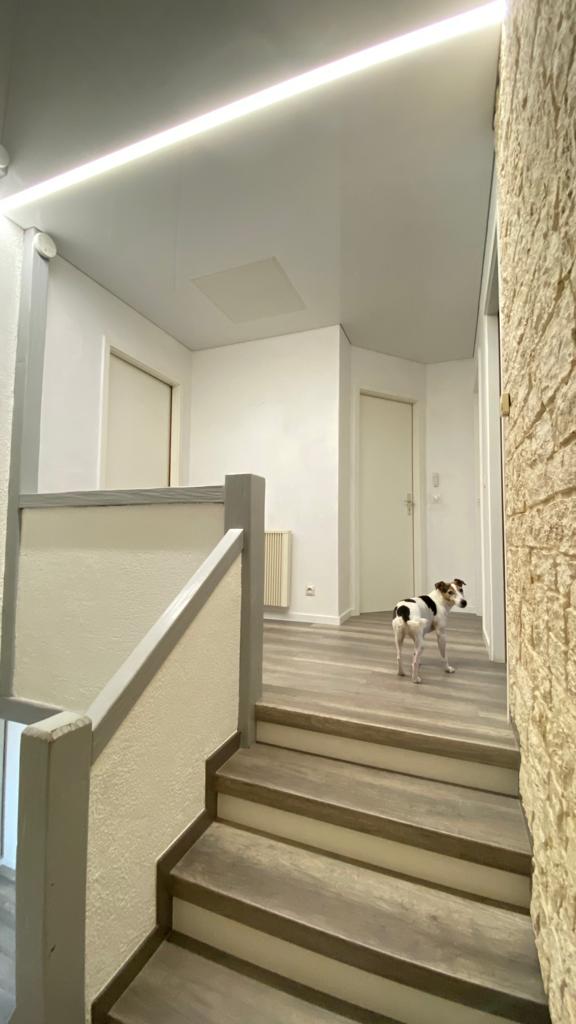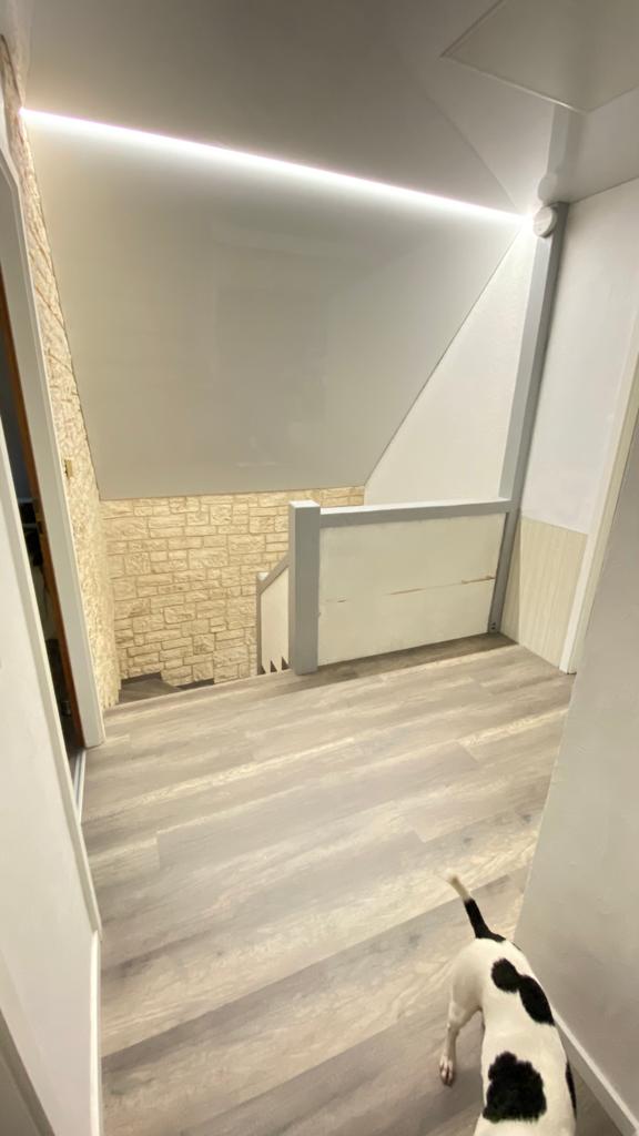 Nous avons choisi un plafond tendu blanc laqué avec un profil LED pour apporter un éclairage agréable et efficace dans cette zone de passage. Un escalier est un espace ou il est tout particulièrement important d’avoir une bonne luminosité afin de s’assurer de voir ou l’on met les pied.