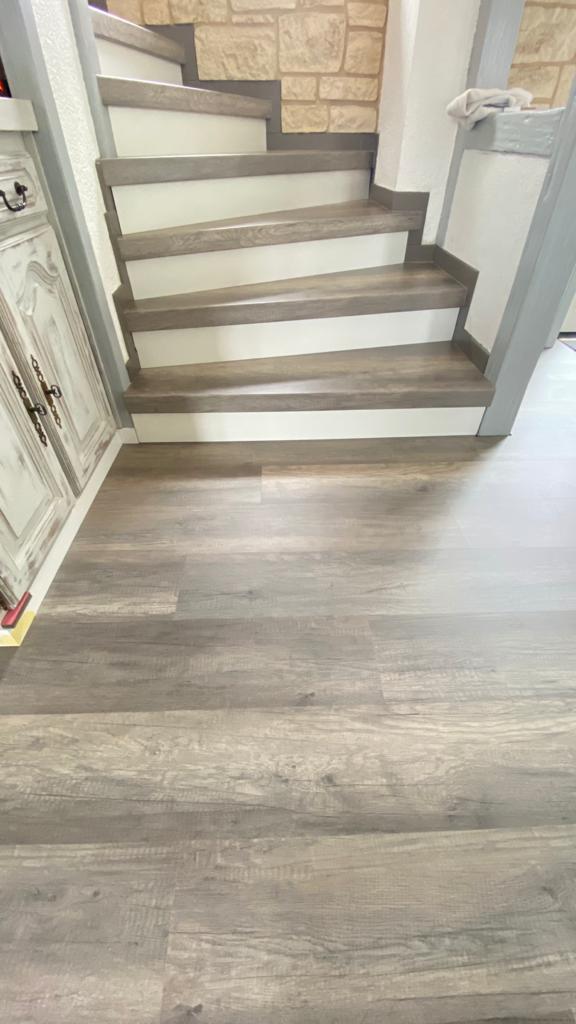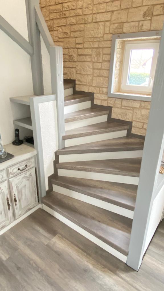 Concernant l’habillage de l’escalier, la mise en place de contre marche blanche et d’un revêtement de marche gris cérusé convenait parfaitement à entretenir une homogénéité de la décoration actuelle de leur maison.