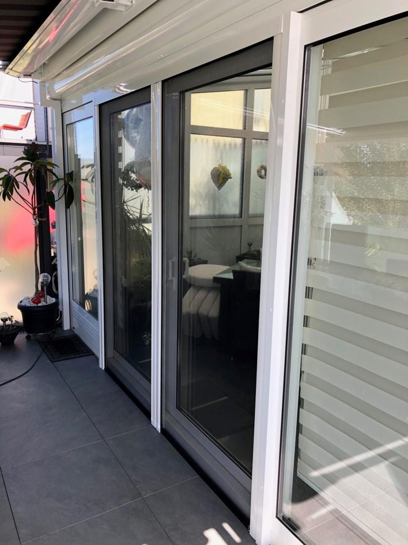 La fixation du store moustiquaire 2 vantaux ouverture centrale de la baie vitrée a été déporté de la structure de la véranda afin de ne pas être gêné par la poignée de la porte.