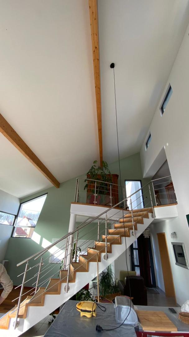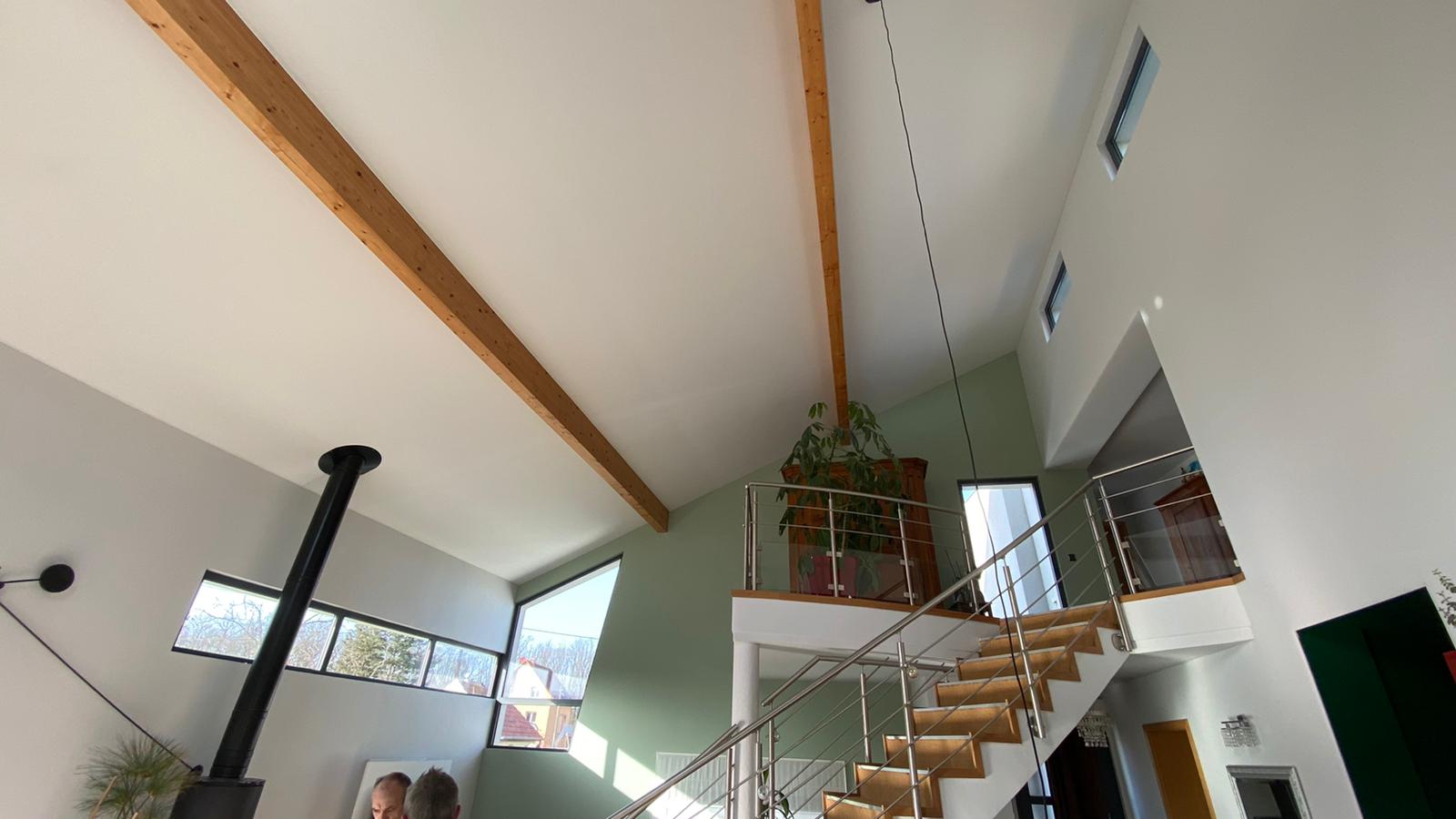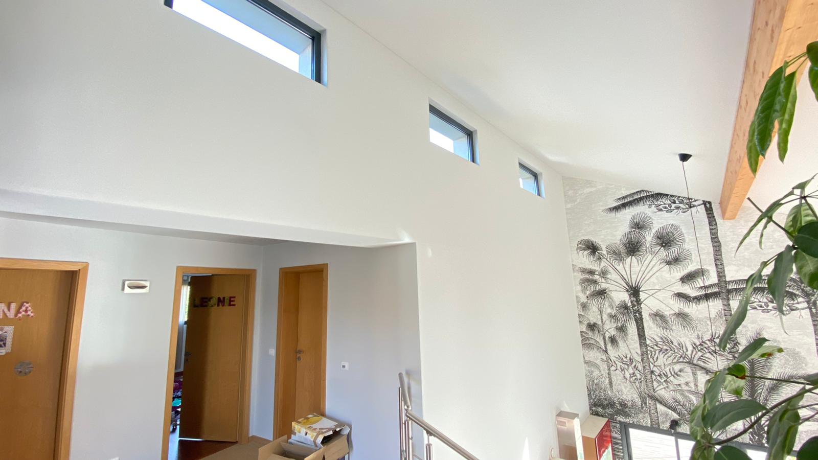 Un projet qui n’était pas si simple : en effet pour la réalisation de ce projet il à été nécessaire d’installer plusieurs échafaudages pour s’adapter aux différents recoins de la maison. Ainsi il nous a été possible de mettre en place un molleton acoustique qui va permettre à la fois de protéger la toile tendue mais aussi et surtout de diminuer très fortement les problèmes d’acoustique que vivait cette famille.
