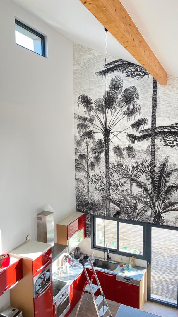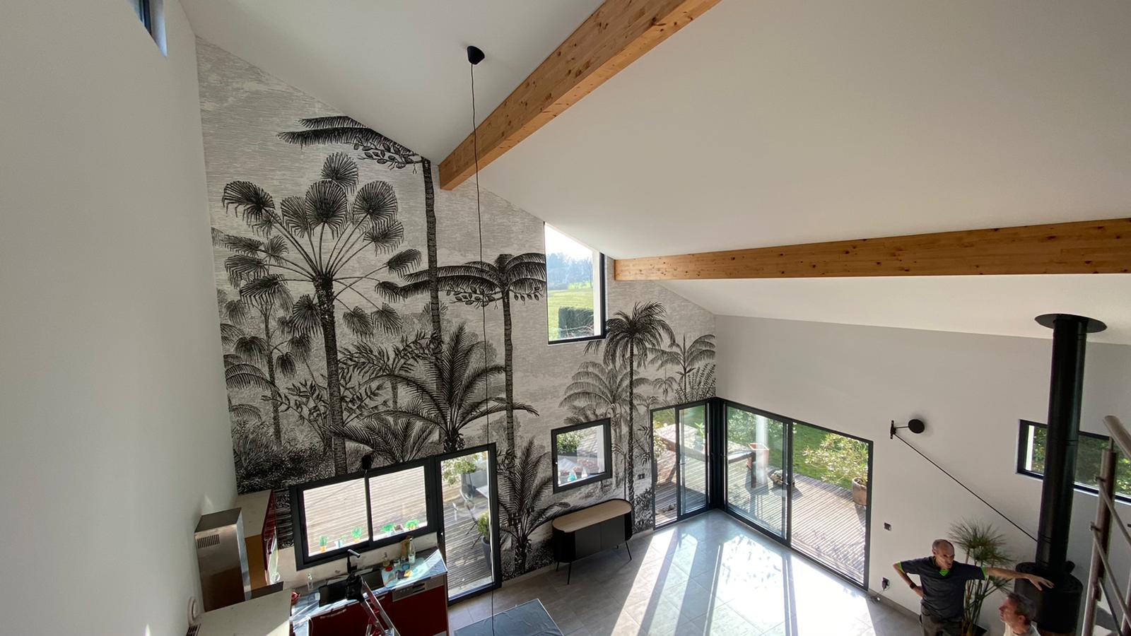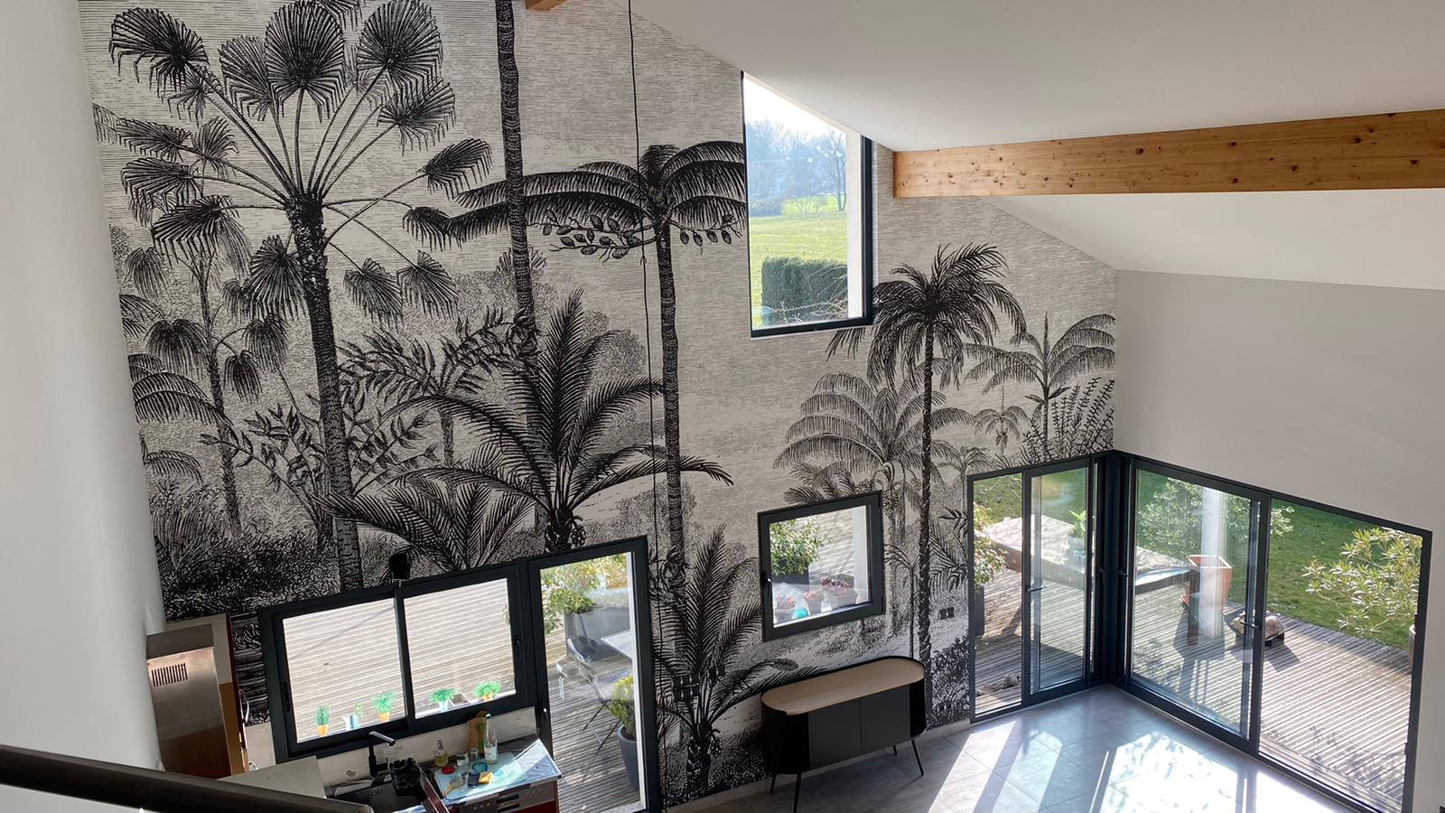 En effet la technique du mur tendu imprimé leur a permis de choisir l’image qu’ils souhaitaient mettre en valeur, ne pas être obligé de choisir un motif proposé par des magasins de bricolage permet une vraie personnalisation de leur intérieur.