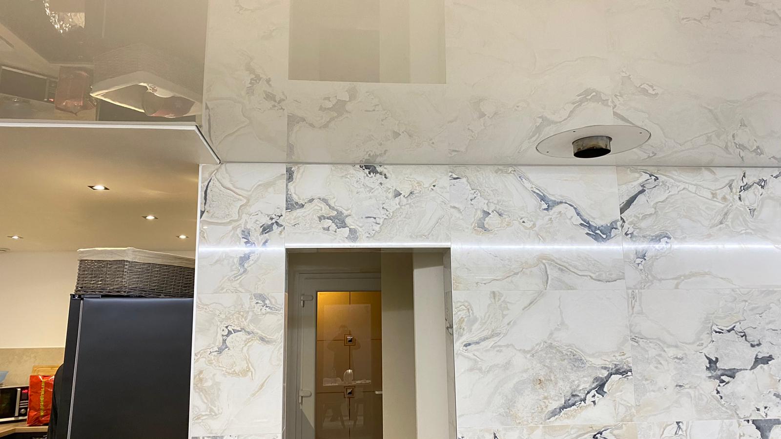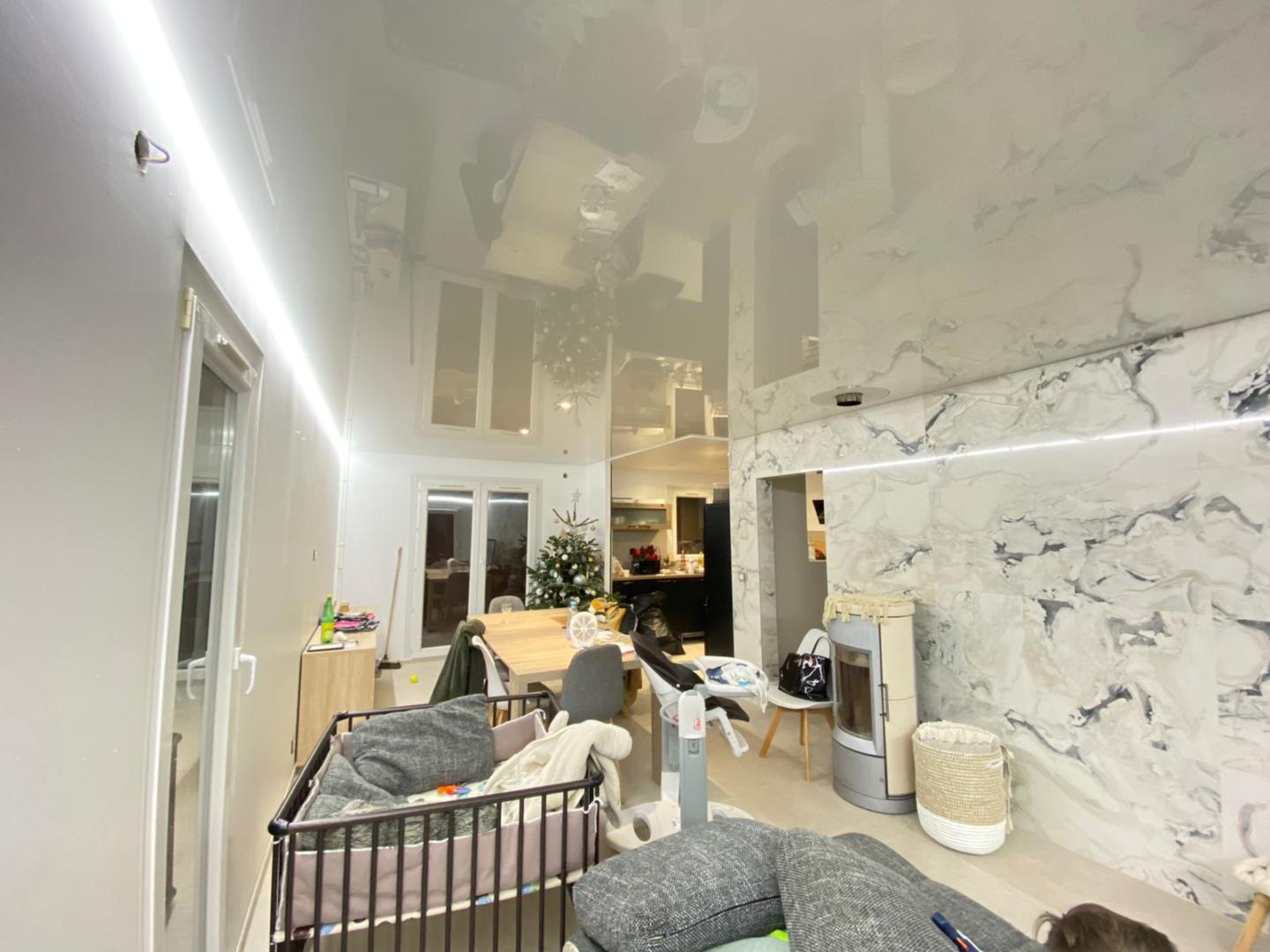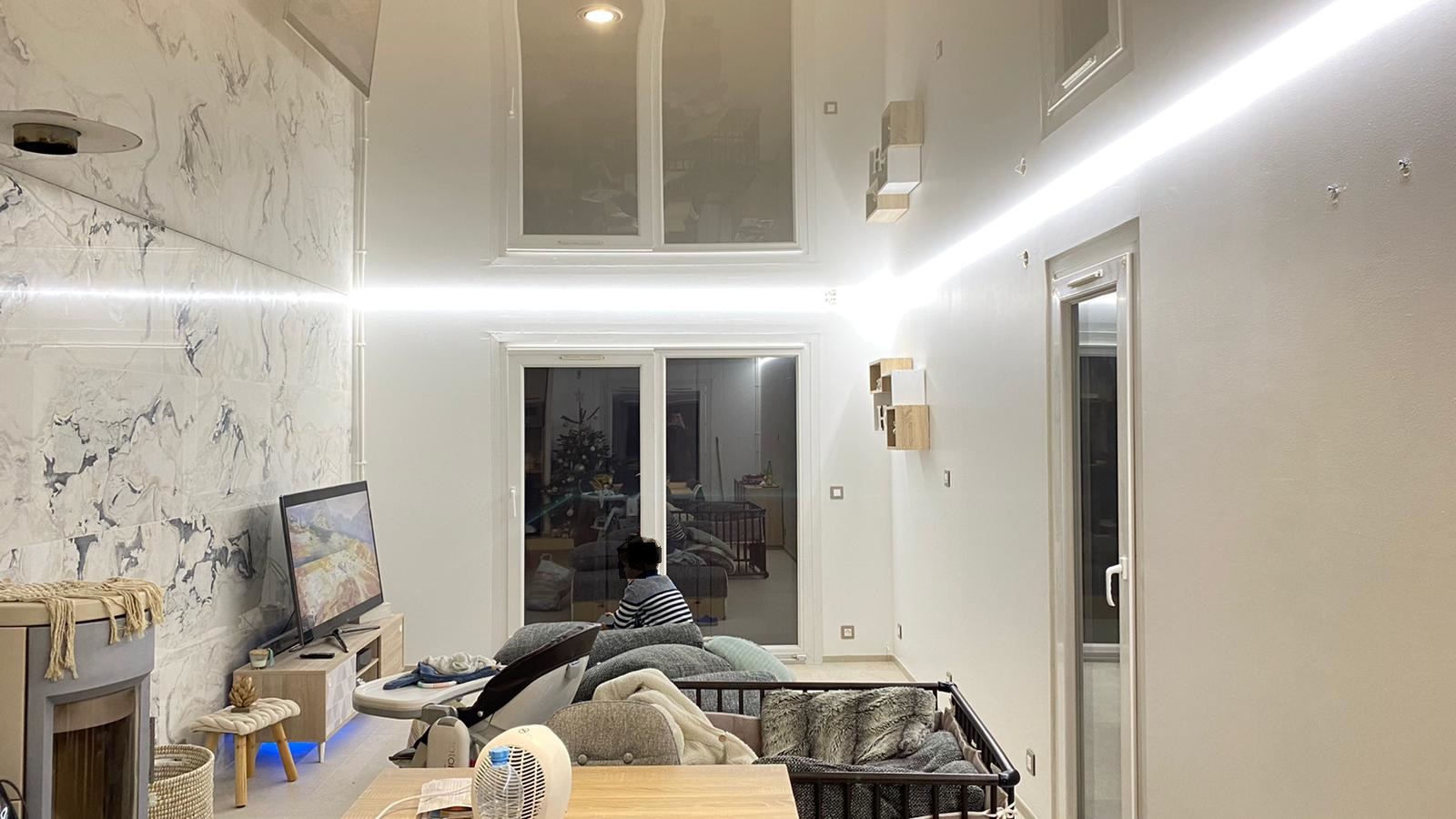 Pour leur séjour ils ont voulu s’offrir une décoration à leur goût et se faire plaisir. Ils ont choisi de réaliser un mur en marbre dans une finition qui leur plaisait mais ils voulaient quelque chose en plus pour parfaire et valoriser leur décoration. Le plafond tendu était la solution parfaite !