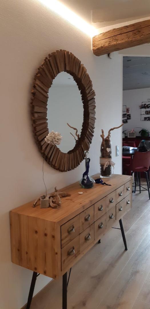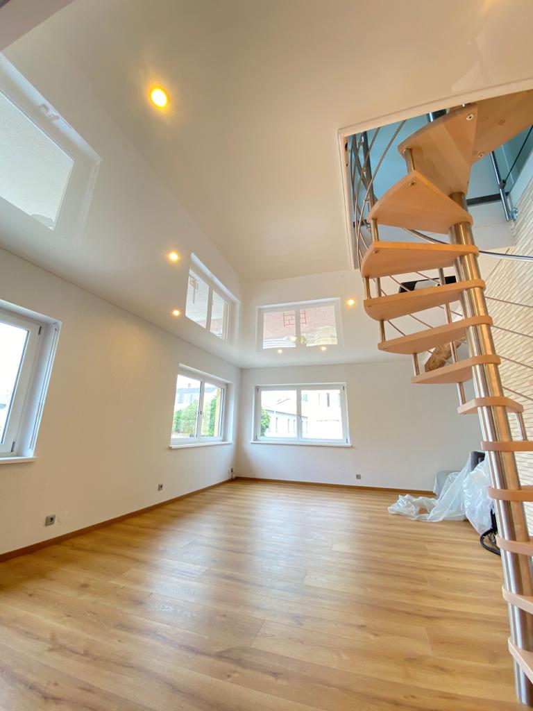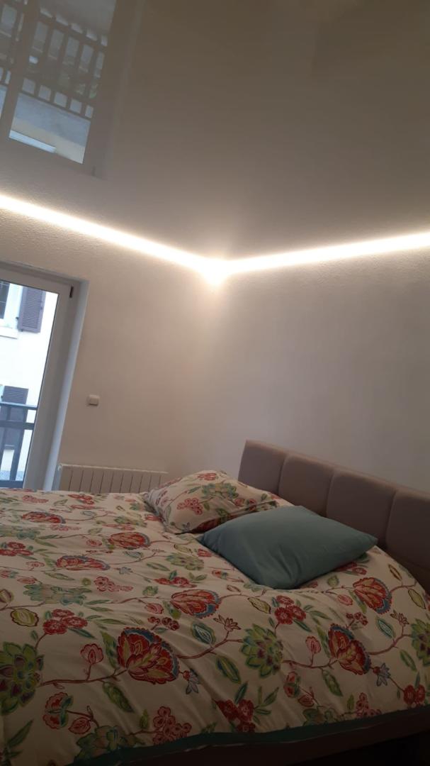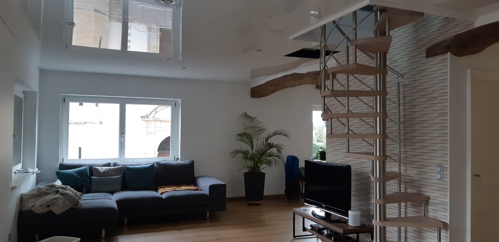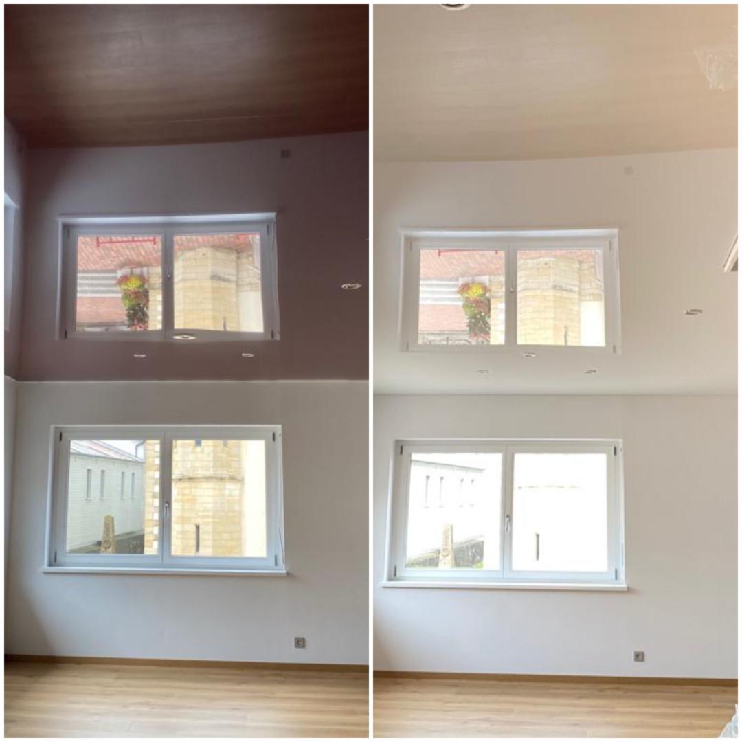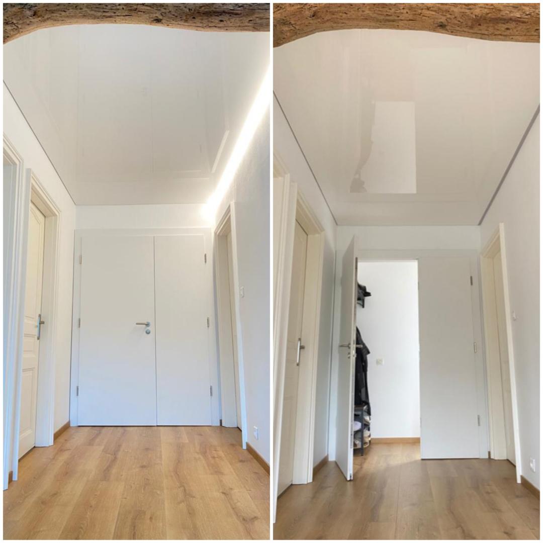 Il s’agit là d’un chantier chez des clients qui connaissaient déjà. Le plafond tendu, ils en avaient un dans leur salon qui avait déjà pas mal d’années. Le plafond était encore en bon état mais ils cherchaient à éclaircir la pièce, ils souhaitaient une ambiance plus moderne, quelque chose qui leur ressemble aujourd’hui!