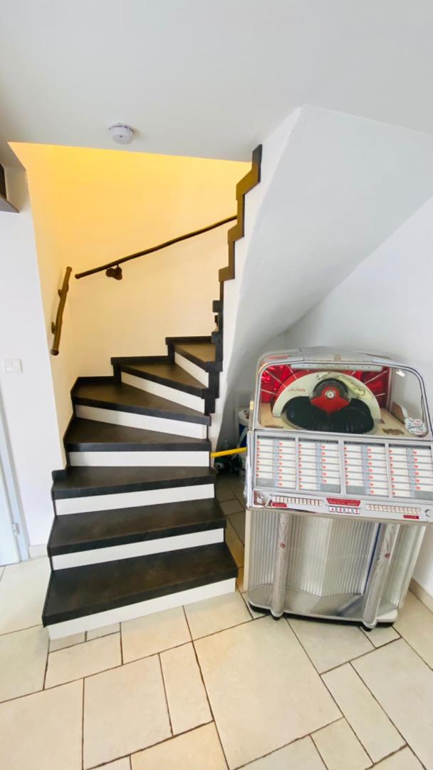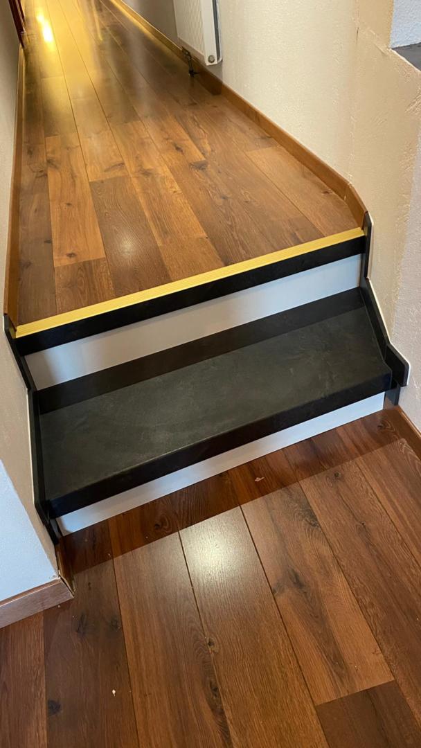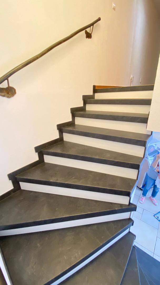 Pour des raisons esthétiques ils ont choisi un habillage de marche imitation pierre de couleurs noir avec des contres marches blanches ce qui permet à la fois de faire ressortir la marche de l’escalier, d’éclaircir la masse que représente un escalier dans une maison, mais aussi parce que c’était la finition la plus évidente avec la décoration de la maison et le parquet en place à l’étage.
