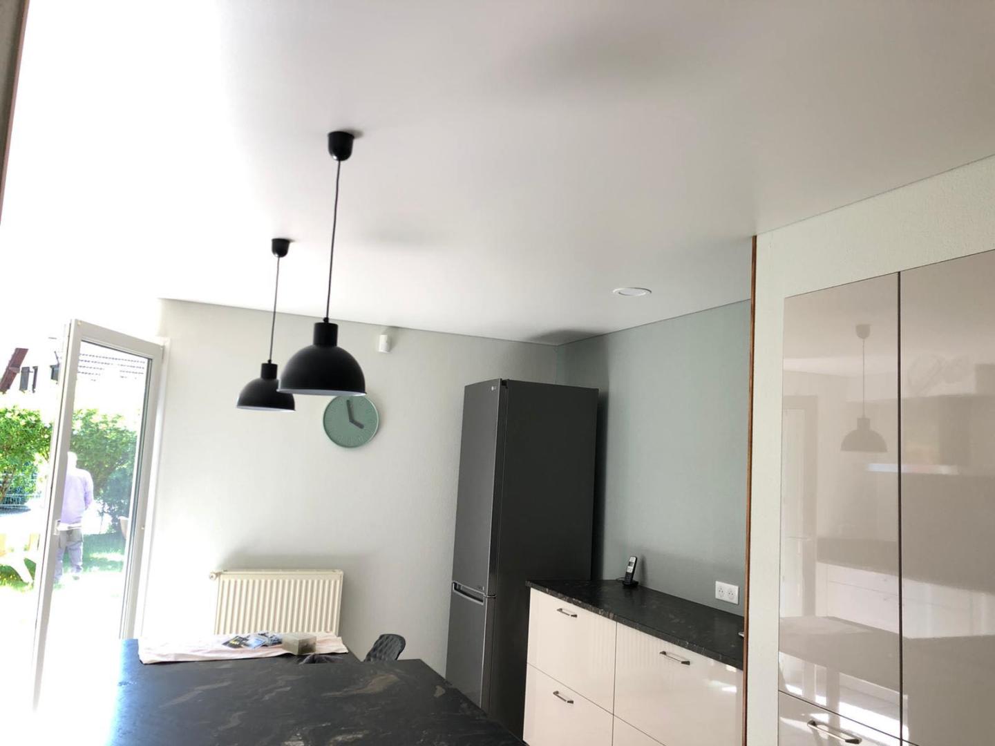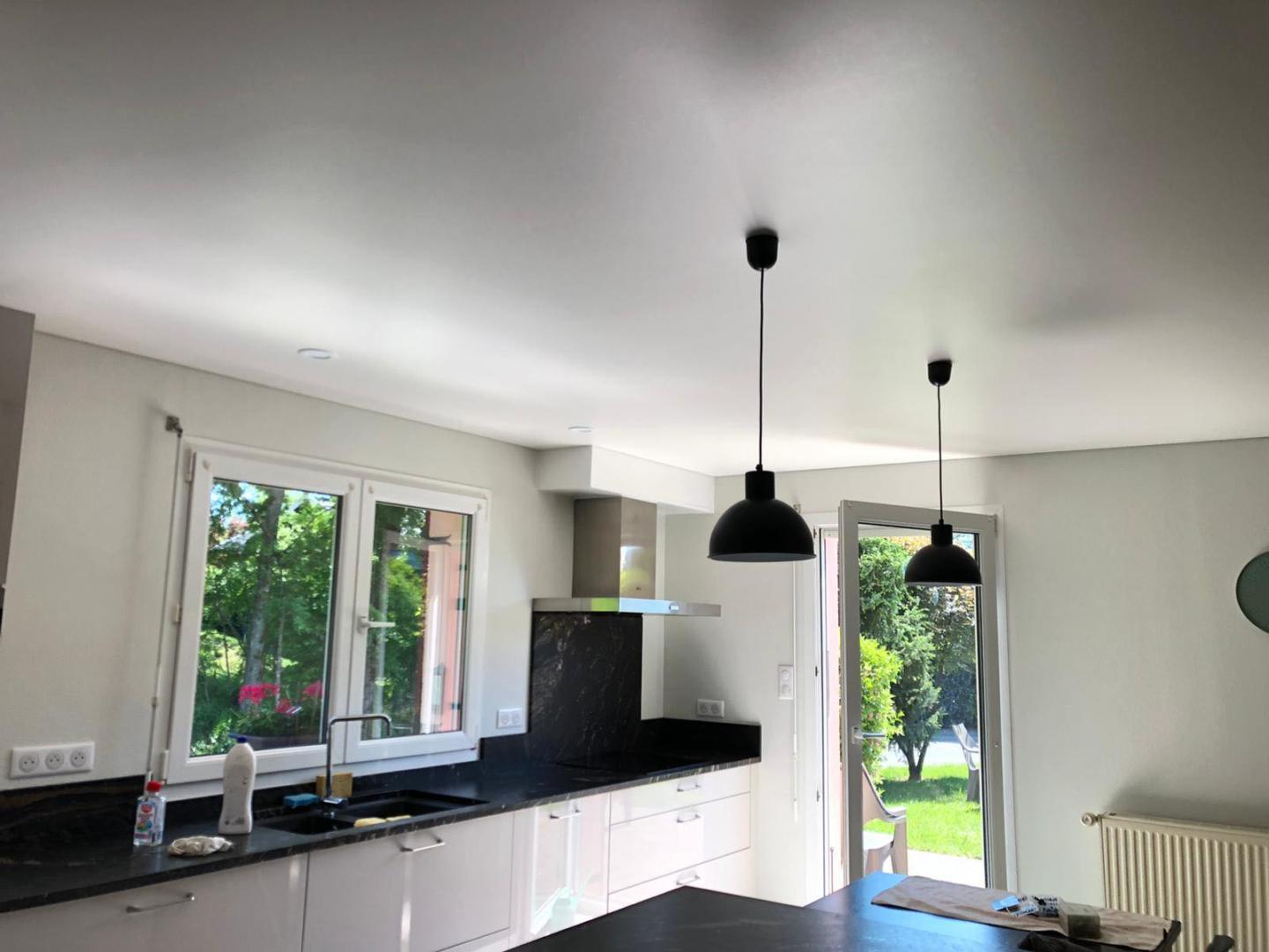 Après avoir pris le temps de leur expliquer ce qu’est le plafond tendu et présenter les différentes possibilités de réalisation leur choix s’est porté sur la mise en œuvre de plafonds blanc mat (qu’ils avaient vu en allant visiter un autre de nos clients non loin de chez eux) pour un résultat sobre et élégant, absolument impeccable.