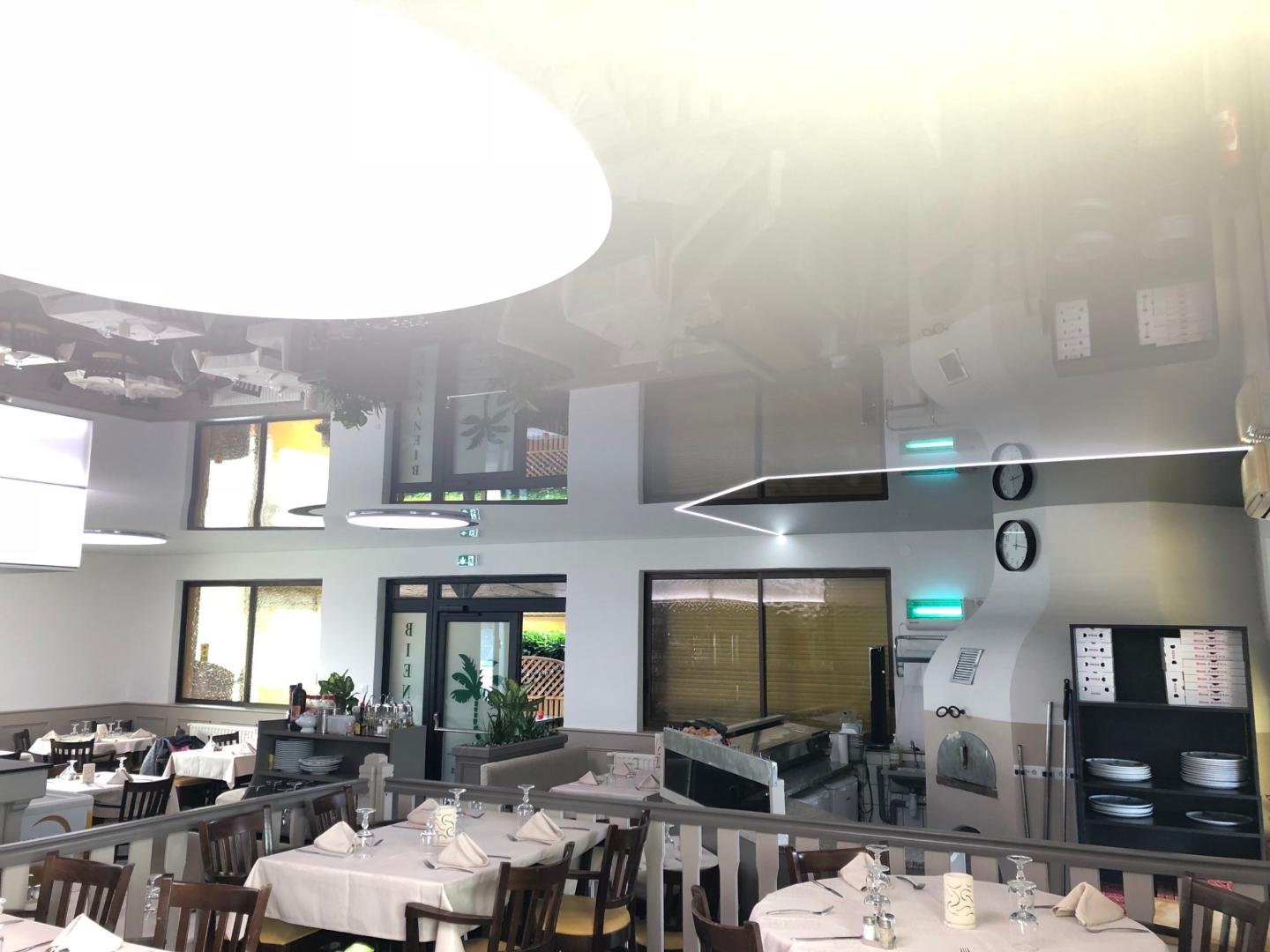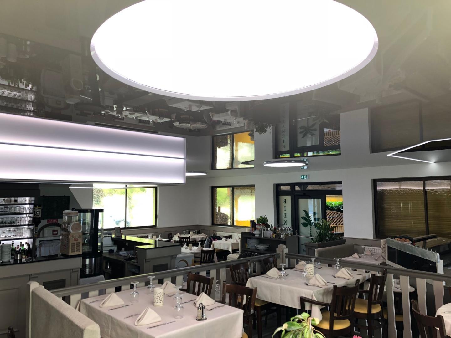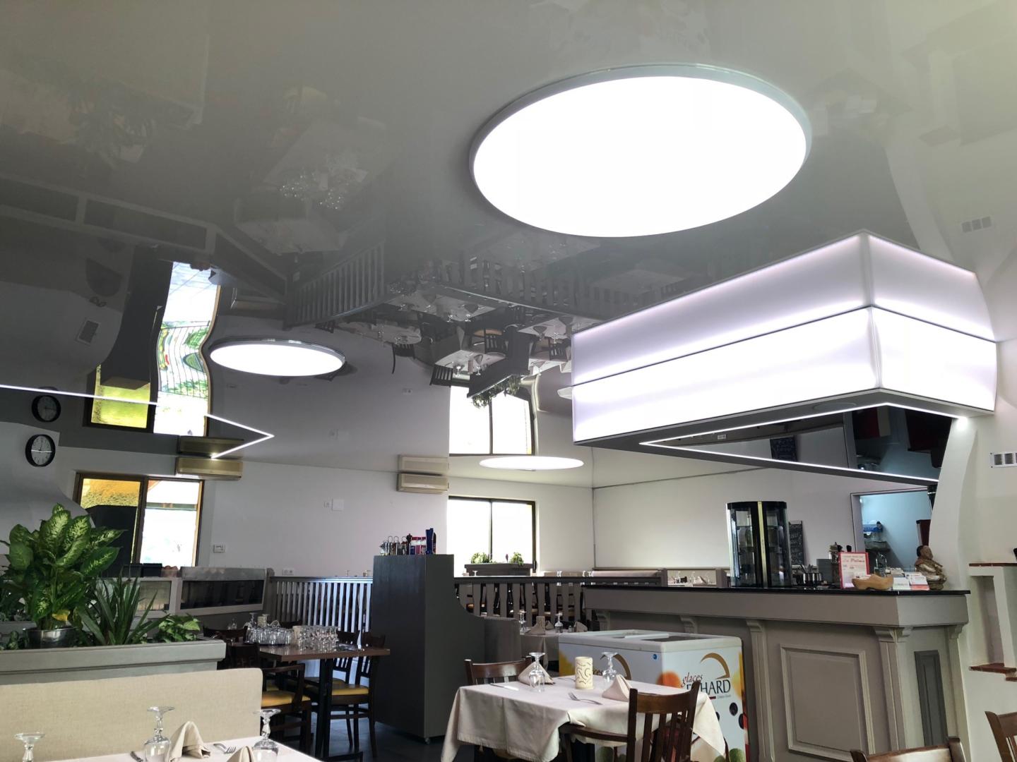 Nous leur avons alors proposé un projet unique alliant esthétique et luminosité, très important dans un restaurant, dans n’importe quel local accueillant du public de fait. Mélangeant des toiles noires et banches laquées ainsi que des toiles translucides rétroéclairées nous avons mis en avant des espaces tels que le four à pizza, le bar ou encore les tables de restaurations.