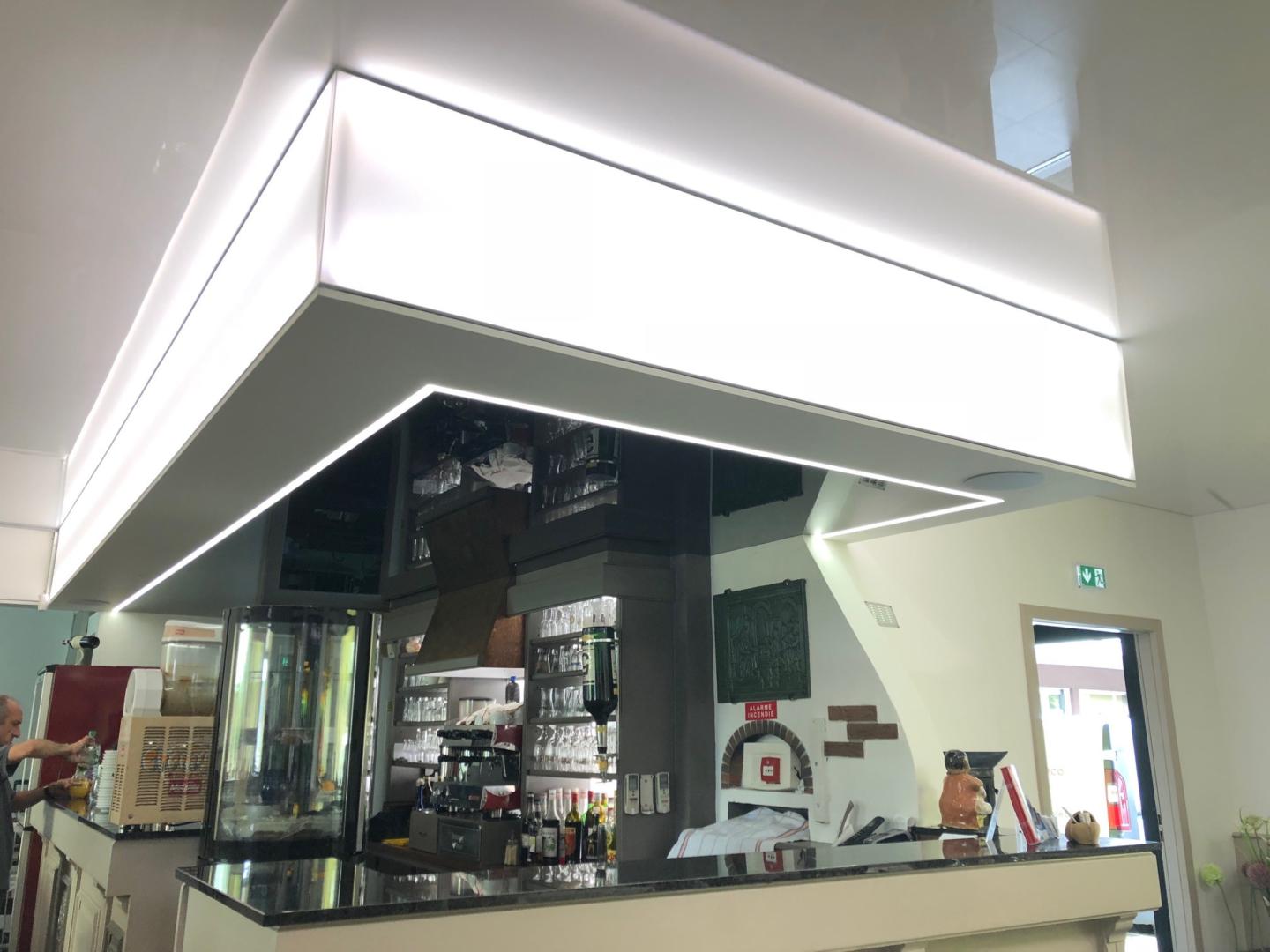 Un travail particulièrement long en coordination avec les autres corps de métier nous a permis de créer des structures uniques pour valoriser chaque espace, notamment au niveau du bar ou nous avons créé une remontée en toile tendue translucide retroéclairée accompagnée d’un profil LED au-dessous, pour une luminosité homogène sur le bar.