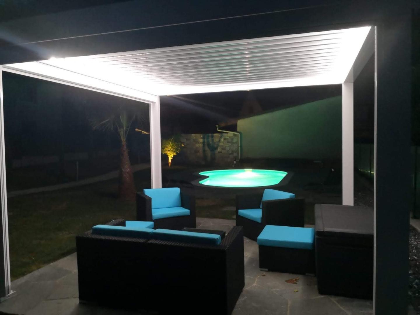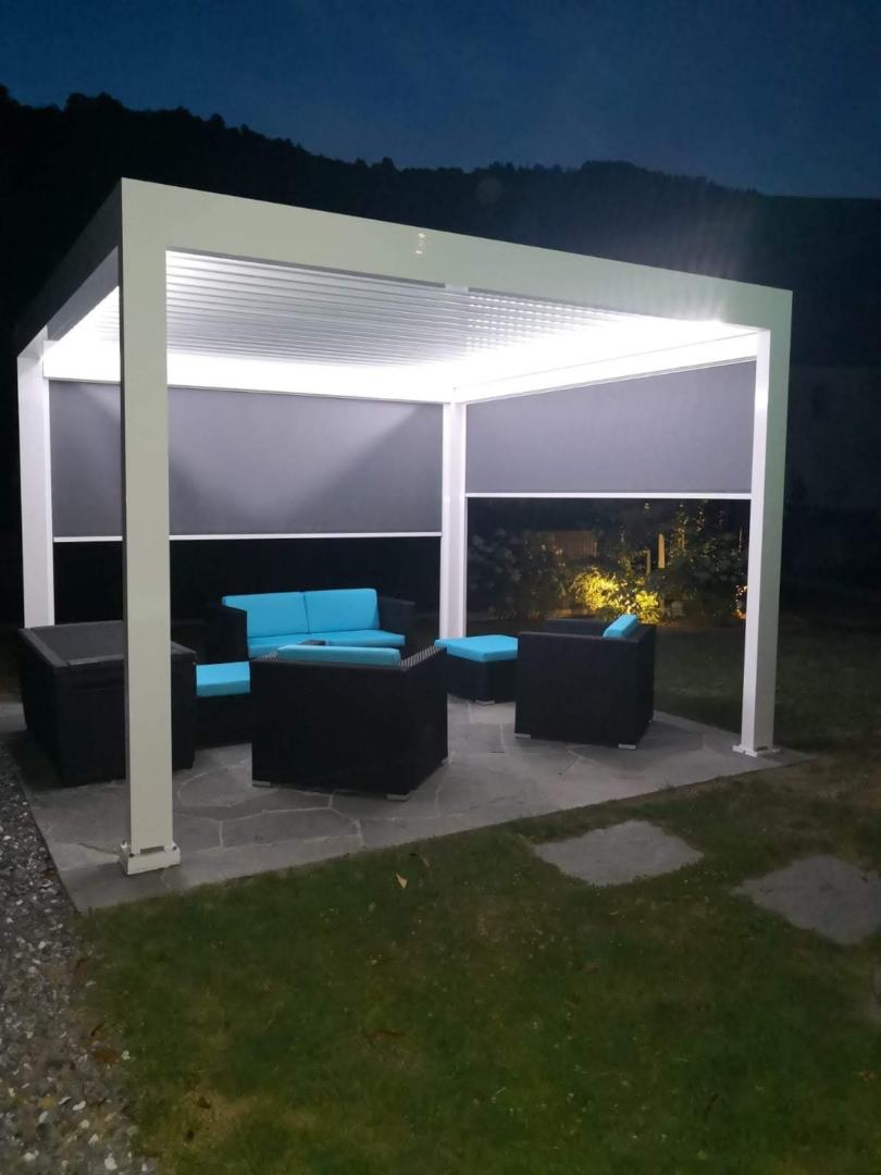 La lumière en bandeau LED sur la périphérie apporte une luminosité douce, agréable est pratique à la nuit tombée tout en créant une vraie décoration design à la pergola.
