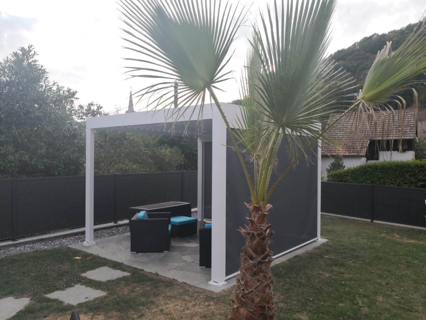 Ici il a été décidé d’installer une pergola « Marquise de France » avec lames orientables pour un passage de lumière et une aération à la demande ainsi que 2 stores verticaux pour se protéger du vent, du soleil, mais aussi pour se créer un espace d’intimité a tout heure du jour ou de la nuit.